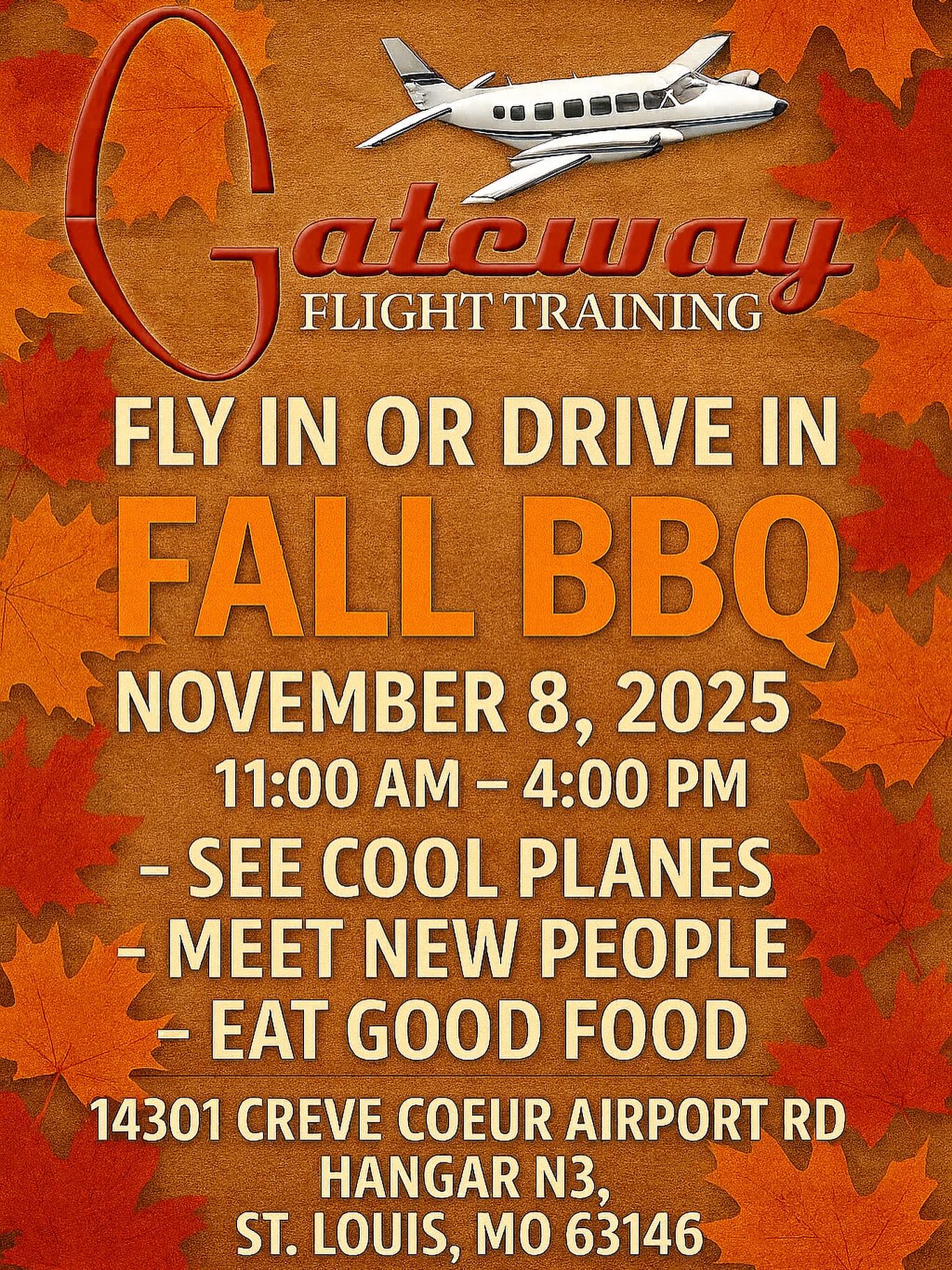 🍂✈️ Gateway Flight Training Fall BBQ – Fly In or Drive In! ✈️🍂 Come hang out with us for a fun fall afternoon at Gateway Flight Training! Whether you’re flying in or driving in, everyone’s welcome. We’re firing up the grill, enjoying the crisp autumn air, and having a good time. **RAIN OR SHINE** We’ll have: • ✈️ Cool planes to check out up close • 🤝 Awesome people to meet and hang out with • 🌭 Tasty BBQ including hotdogs, burgers, chips, coleslaw, and all the favorite fixings! 📅 When: Saturday, November 8, 2025 🕒 Time: 11:00am - 4:00pm 📍 Where: Gateway Flight Training at Creve Coeur Airport (1H0) 14301 Creve Coeur Airport Rd, Hangar N3 St. Louis, MO 63146 ✈️ Pilots: Fly in to the airport (1H0) 🚗 Locals: Drive in follow the signage placed at the airport — plenty of parking available. Whether you’re a pilot, a student, or just love airplanes and good food, this is a great way to spend a fall day. Bring your friends, bring the family — everyone’s welcome! 🔥 Free to come hang out. Just show up hungry and ready for a good time! ***RSVP on Facebook event page***